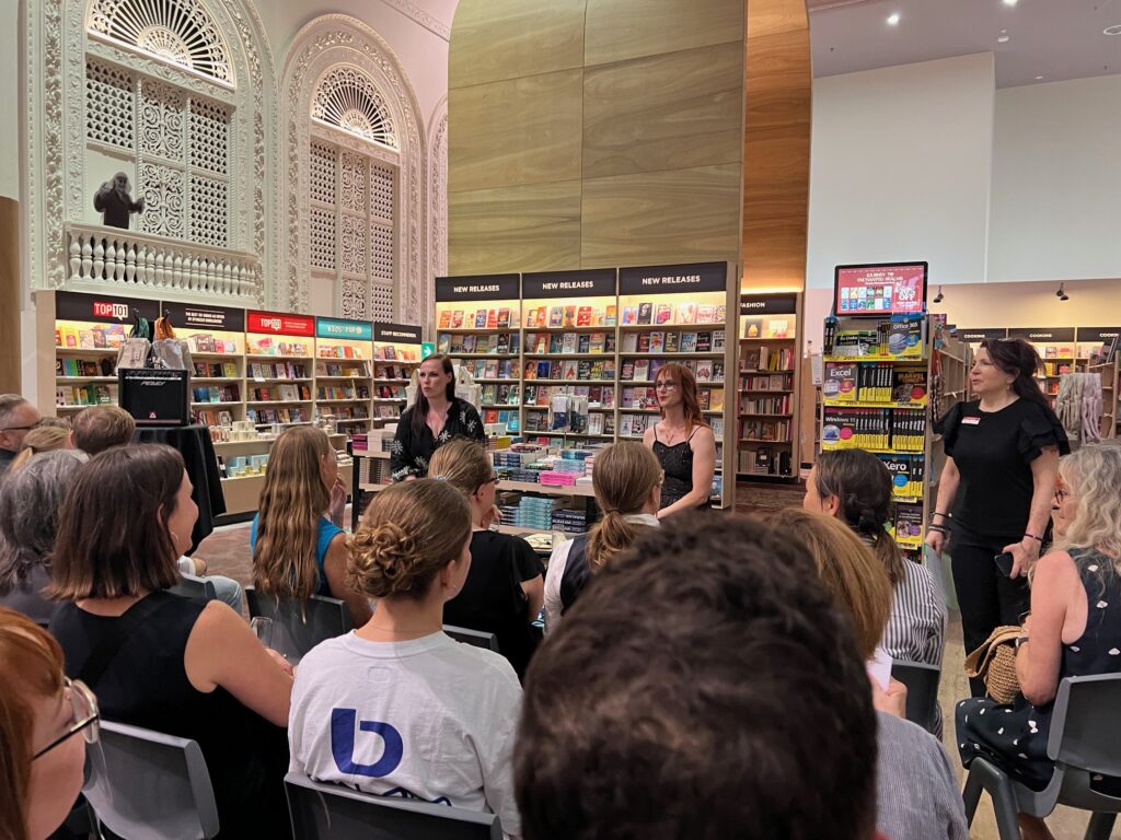 At some stage Margo read from her book. Lisa also asked a bunch of questions based on a swinging gemstone that landed on some symbols… It was a fantastic night. There were even bead bracelets on offer and freshly cooked purple cup cakes! Here are some photos of Margo (centre), with Lisa (left), and some have Adelaide’s Dymocks manager (right) at the amazing Dymocks Adelaide building (remind me to get a photo of the stunning ceiling soon when I go there to write over lunch). I was going to edit these, but they are just so good I didn’t want to remove any of the building and don’t think anyone else is identifiable. Again what an awesome Dymocks building!